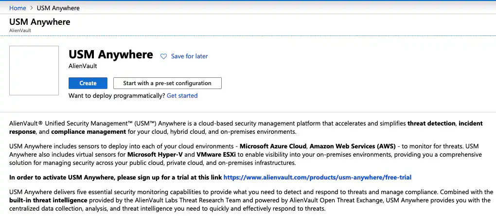 - Click Create. This starts the deployment of the USM Anywhere Sensor, which can take up to six minutes.