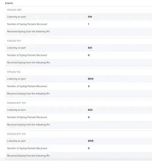 - Received Syslog from the following IPs: List of IP addresses forwarding logs to the sensor. There is a maximum of 100 IPs, and IPs not sending logs in the last 24 hours are discarded. (Restarting the sensor resets this list.)