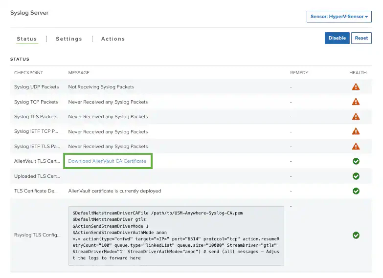 After you have configured the syslog forwarding policy on the required data sources, you can verify the log forwarding in USM Anywhere. When you select the sensor on the Syslog Server page, the Health column displays