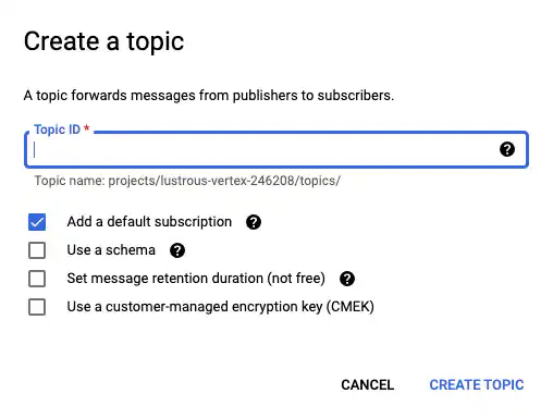 By default, the Add a default subscription checkbox is selected. The subscription for this topic will be automatically created using the default settings. Its name is [topic]-sub (for example, MyTopic-sub). If you leave this checkbox deselected, you will need to create a subscription. See To create a subscription for a Cloud Pub/Sub topic for more information.Note: Make note of this name, as you will need to reference it when creating your export sinks.
