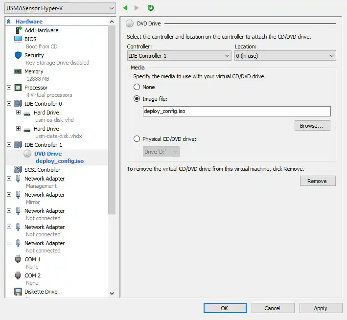 - Select Image file, and then click Browse to locate the deploy_config.iso image file that was extracted from the USM Anywhere Sensor package download.