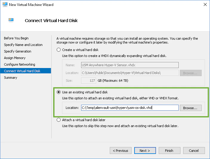 In Connect Virtual Hard Disk, select Use an existing virtual hard disk, and then click Browse to locate the usm-os-disk.vhd file that was extracted from the USM Anywhere Sensor package download.