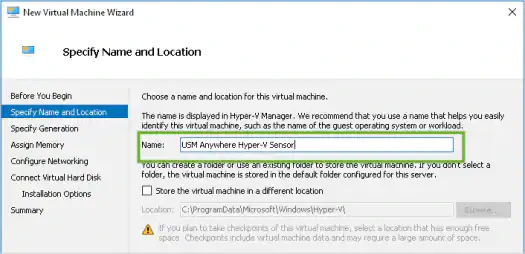 In Specify Name and Location, enter a name for the new VM, and then click Next.