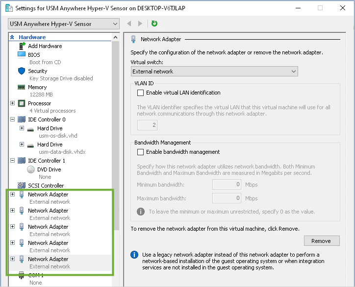 Warning: The Hyper-V Sensor requires *all five network interface cards (NICs) *to be enabled; otherwise, the USM Anywhere update will fail. The NICs can remain disconnected.See Configure Network Interfaces for On-Premises Sensors for more information about these interfaces.