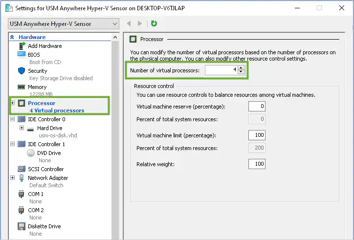 In the left navigation menu of the dialog box, select Processor, and then set the number of virtual processors to 4.
