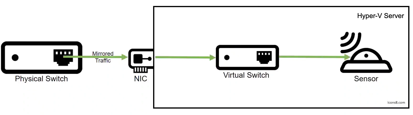 - Allocated a spare network interface card (NIC) to direct the mirrored traffic to the virtual switch.