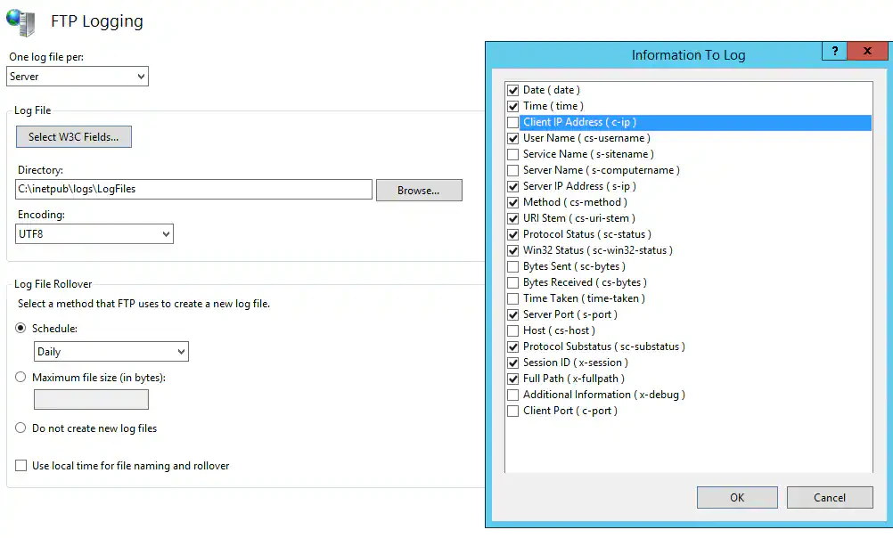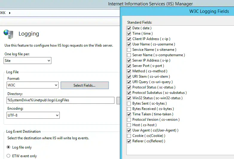 Under Log File, click Select W3C Fields, and then select the information you want to log.