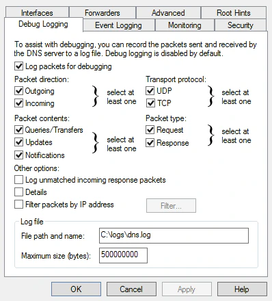 Before configuring NXLog, you need to enable debug logging on the DNS server.To enable DNS server debug logging