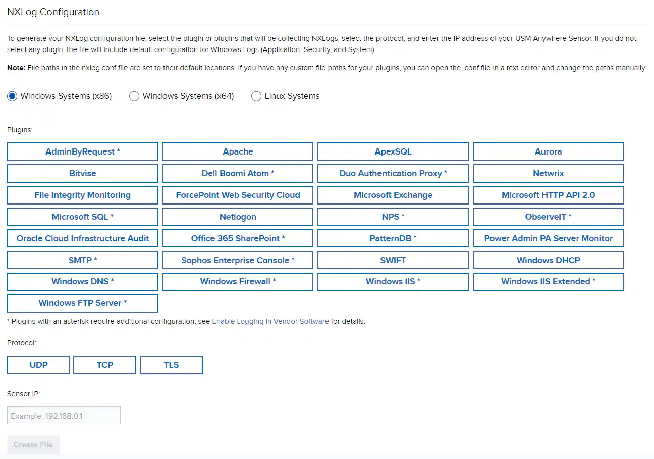 Note: Plugins with asterisk require additional configuration on the Windows host. See Enable Logging in Vendor Software for details.