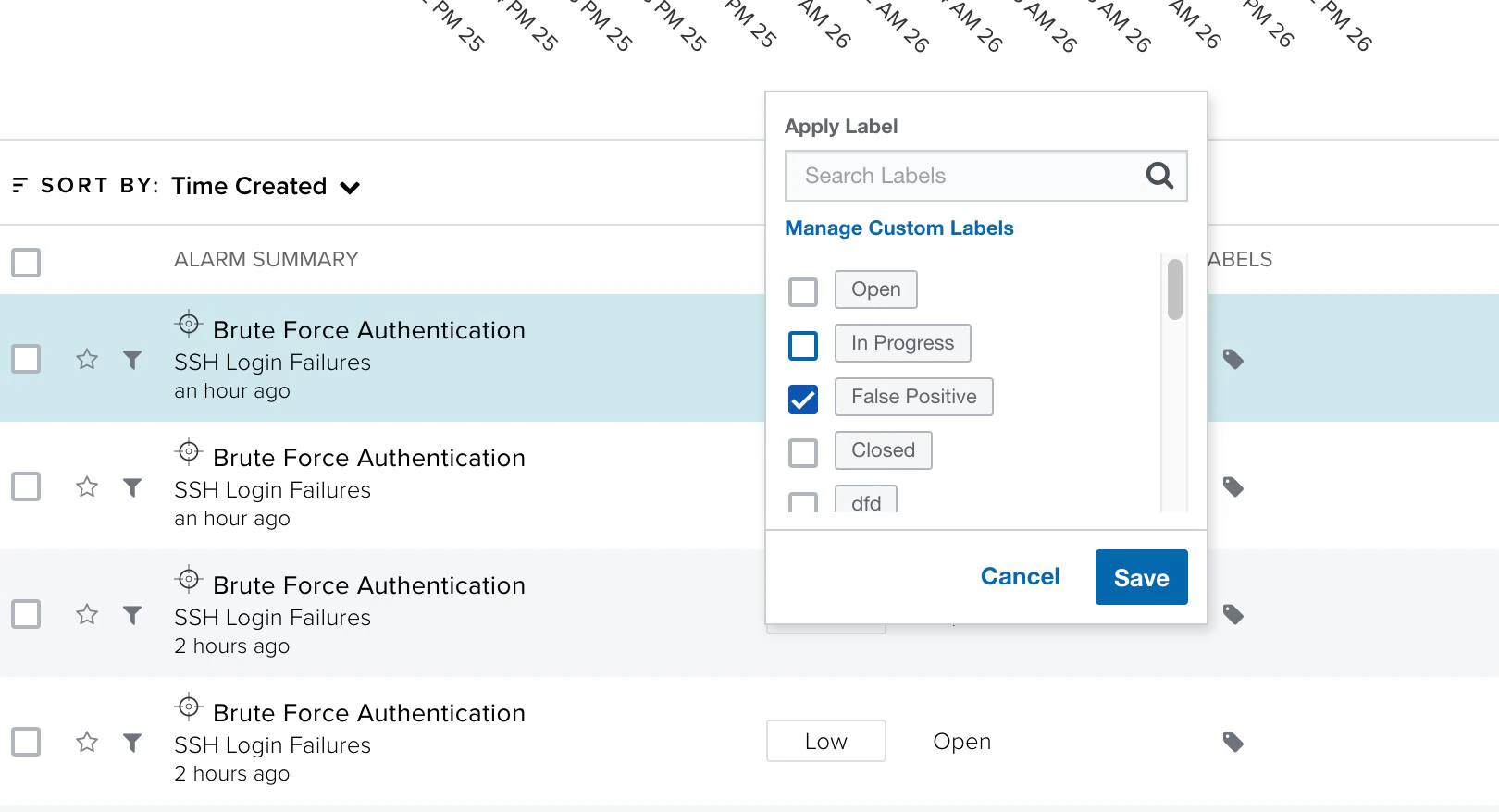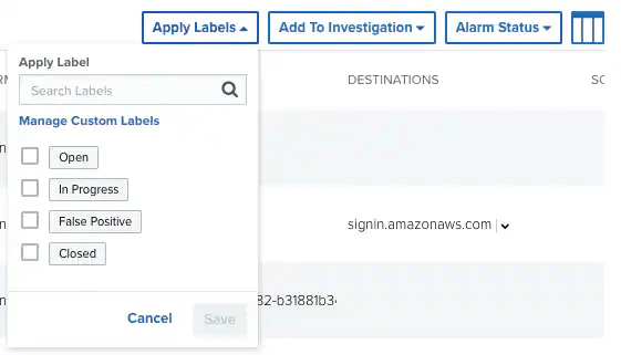 Select the checkbox to the left of an alarm, click Apply Labels, select the label, and click Save.