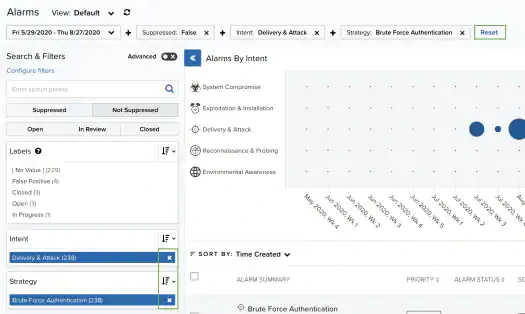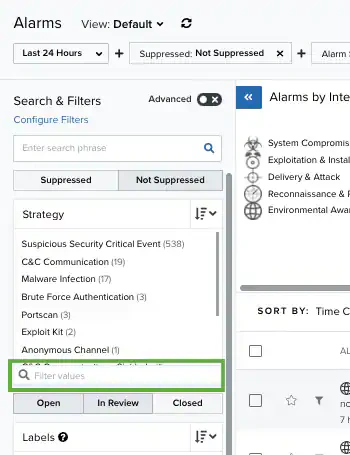| Intent | Filter alarms by the purpose of the alarm. It can be Delivery & Attack, Environmental Awareness, Exploitation & Installation, Reconnaissance & Probing, and System Compromise. See Intent for more information. |