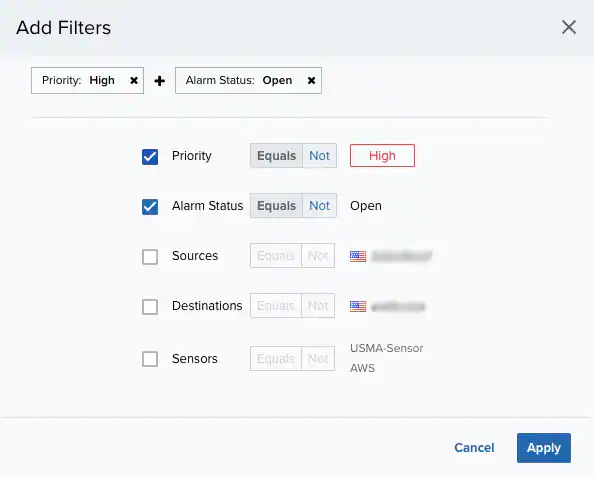 | Sensors | Filter alarms by the associated USM Anywhere Sensor. See USM Anywhere Sensor Management for more information. |