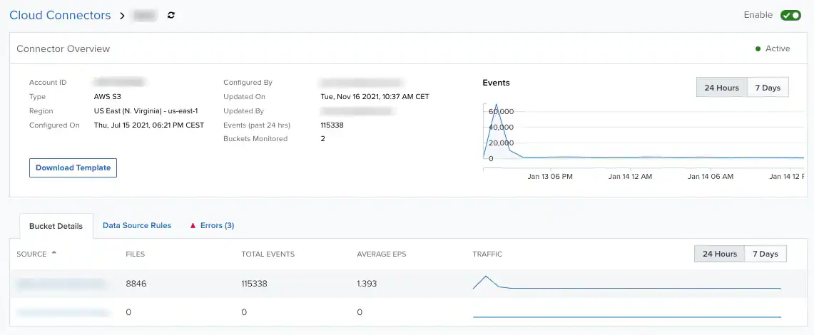 - For the AWS S3 Cloud Connector type, there is a graph providing bucket events by the latest 24 hours or past seven days, and a button to download the associated AWS CloudFormation template.