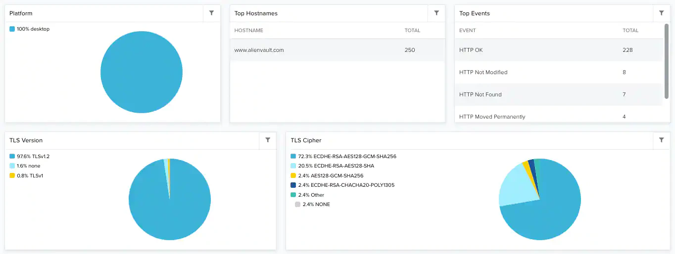 | TLS Cipher | Pie chart displaying, in percentages, the main events by Transport Layer Security (TLS) Cipher. |