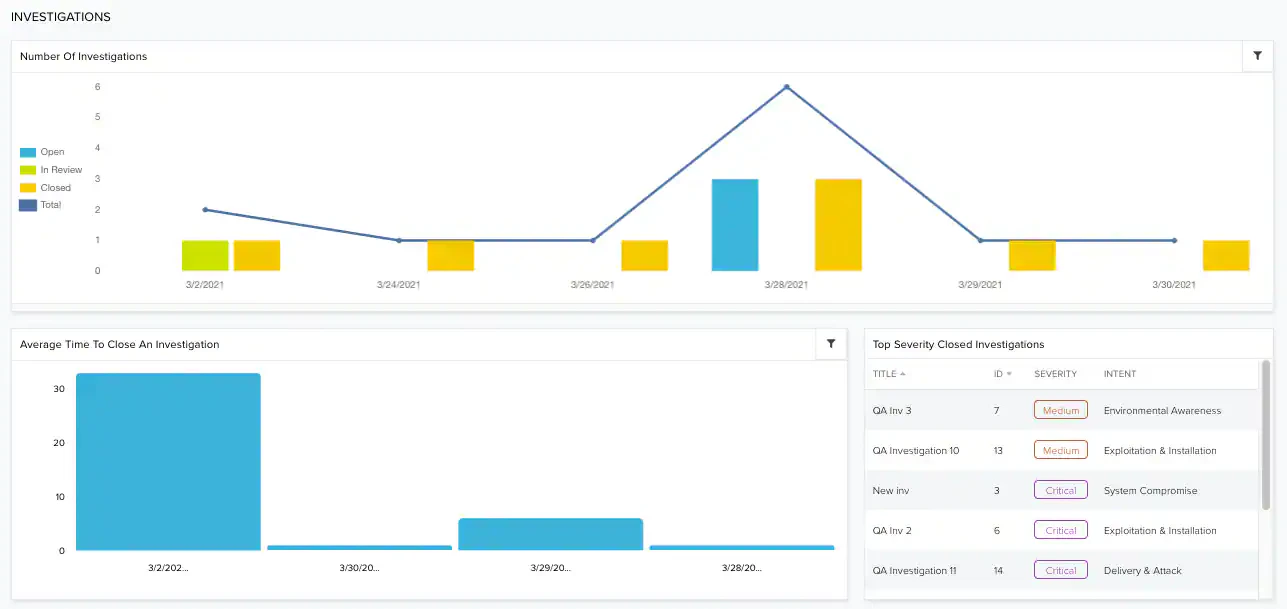 | Number of Investigations | Number of all investigations in your environment. The options are open, in review, and closed. |