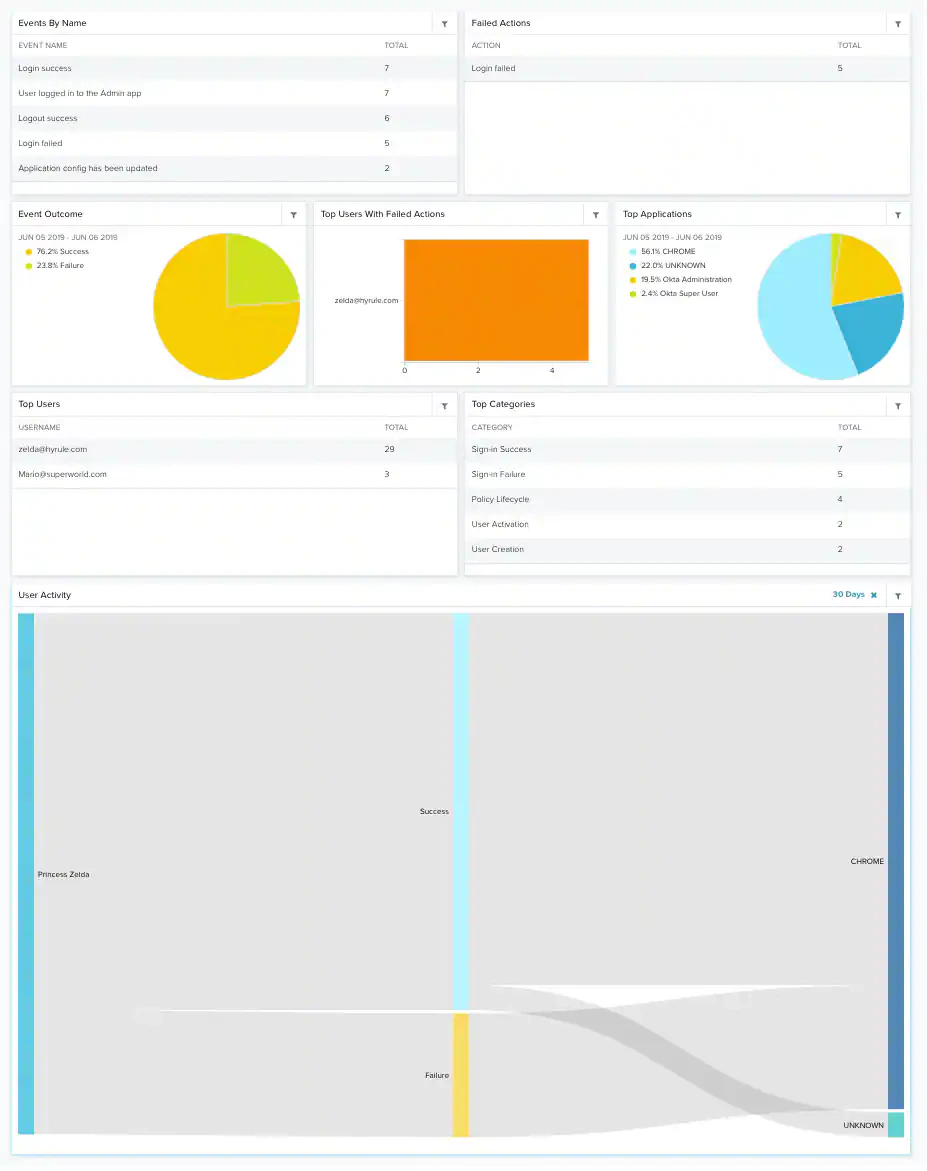 | User Activity | Sankey diagram that displays the Okta user activity. |