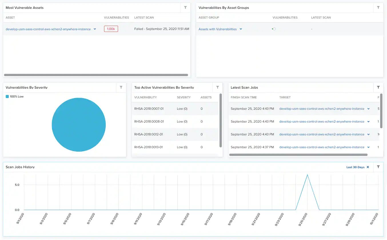 | Latest Scan Jobs | List of the 5 latest scans run in your environment. It includes the scan date and the number of vulnerabilities found. |