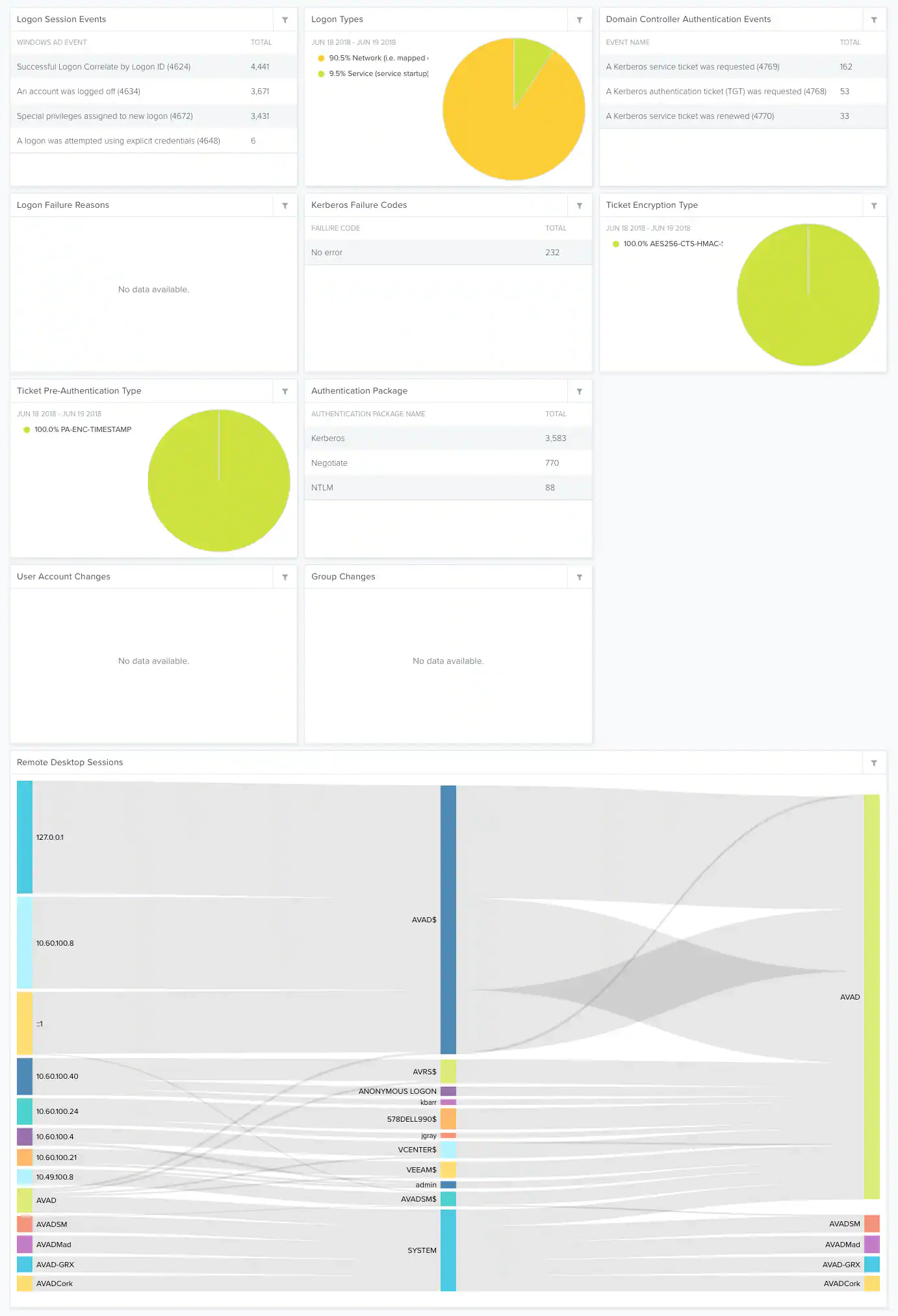 | Authentication Package | Top Active Directory authentication packet types. For example: Kerberos or NTLM. |