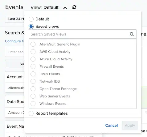 USM Anywhere includes several predefined views of events based on usual environments and technologies. These views have pre-defined column headers that show the most relevant event fields. You can see a summarized event view without having to spend the time creating a custom view. These predefined views operate the same way as the views you can create yourself. Some of these views have also predefined filters. To open the predefined views- Go to Activity > Events.
