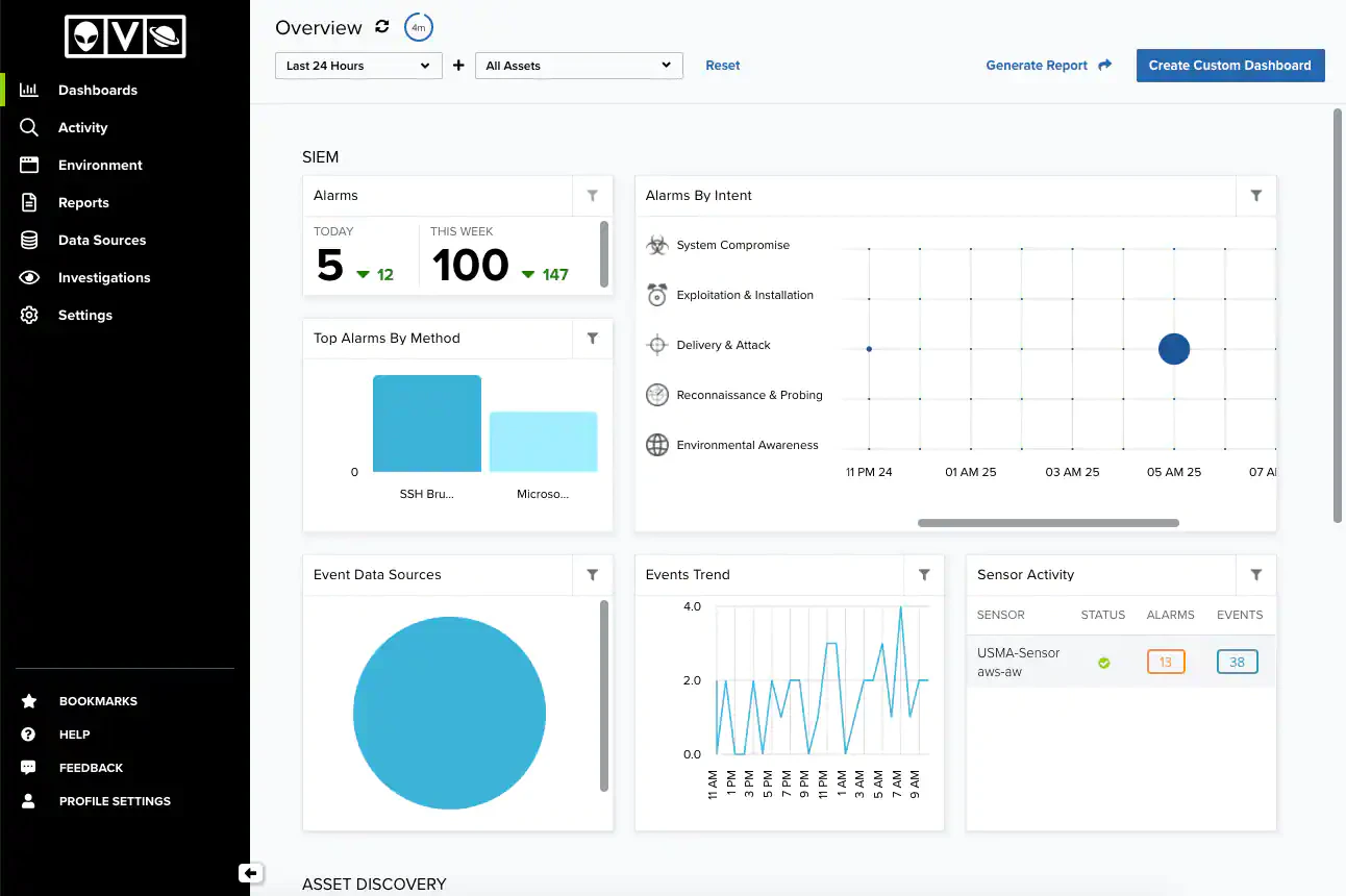 - Dashboards. Provides charts, tables, and graphs. There are dashboards that will be displayed depending on the sensor you have installed; there are also dashboards related to the AlienApp you have configured and that will be visible if you have data for them. See USM Anywhere Dashboards for more information.