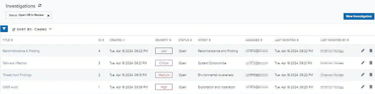 Note: USM Anywhere automatically assigns every new investigation to the user who creates the investigation. - Click Save.