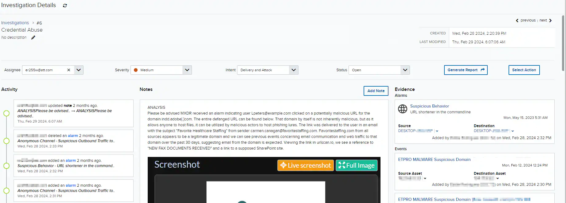 icon next to the name if you want to make changes to the item. See Investigations List View for more information about the fields. Below the investigation name displays the ID of the investigation. To the right is information regarding the created and the last modified dates. You can change the values displayed in the Assignee, Severity, Intent, and Status drop-down lists. The modification is automatic, so once you change a value, it is updated.