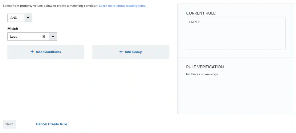 Click Add Conditions and select the property values you want to include in the rule to create a matching condition.