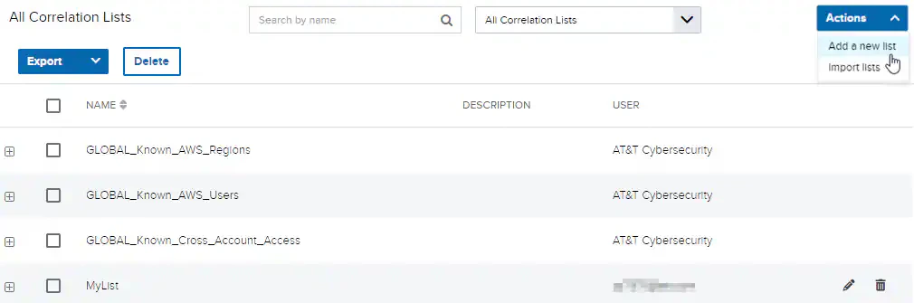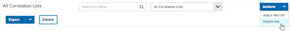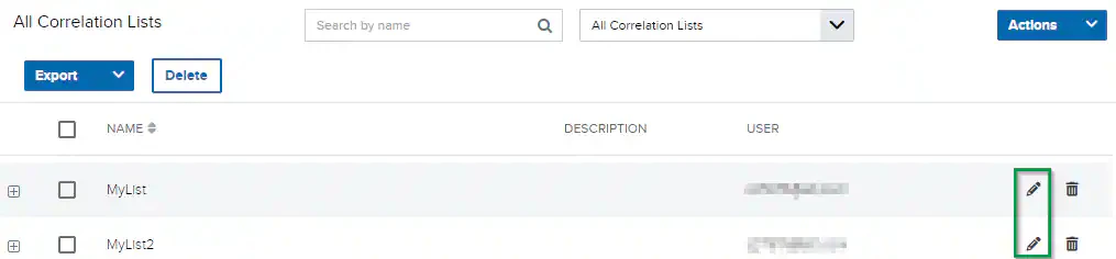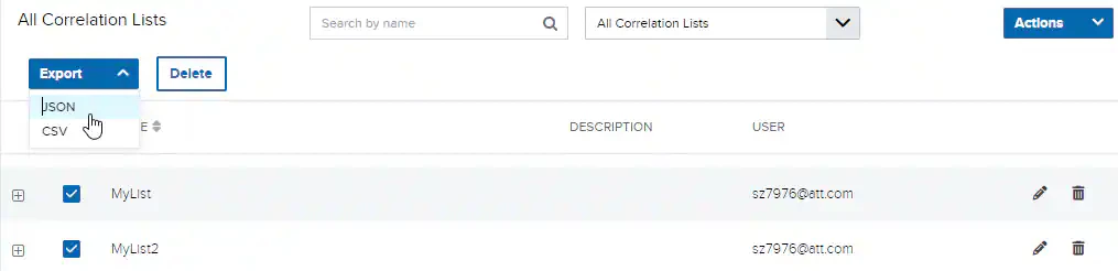 Note: Only users in the Manager role can delete any correlation list. Users in the Analyst role can only delete correlation lists that they created.