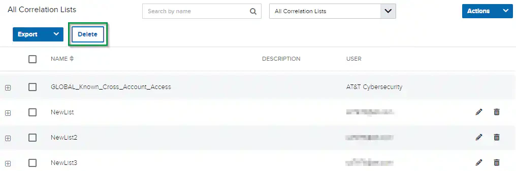 - Select one or more checkboxes for the user-generated correlation lists you want to delete.