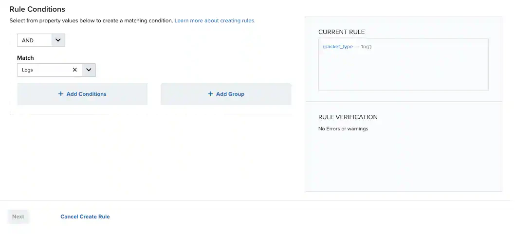 Click Add Conditions and select the property values you want to include in the rule to create a matching condition.