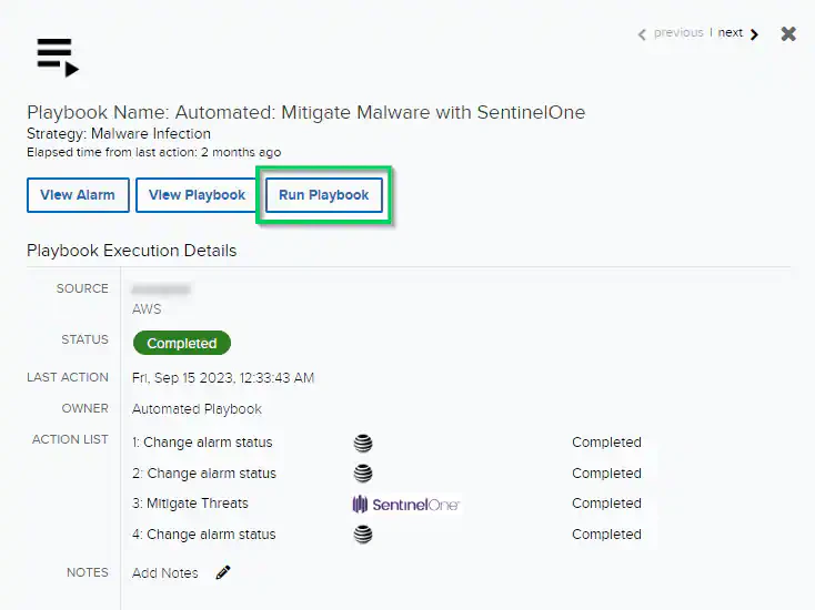 If this playbook is already in progress for this alarm, the next action that has not yet been run will be available.