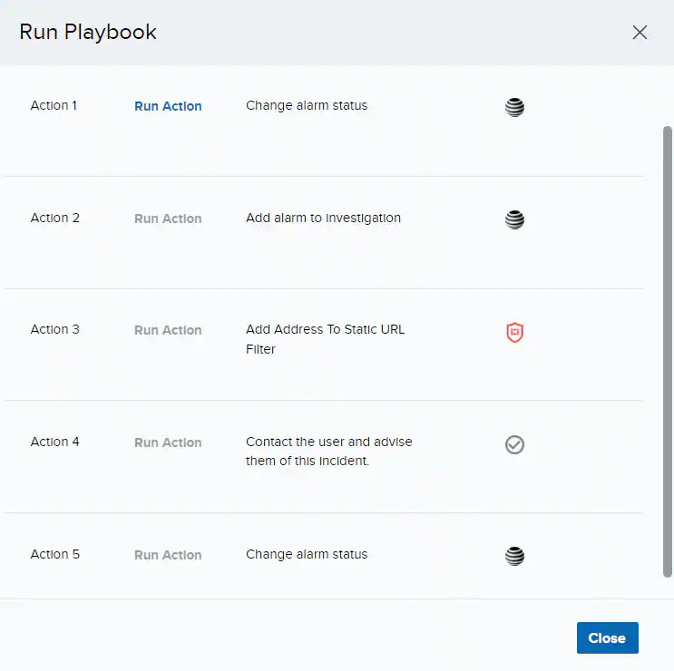 The Run Playbook dialog box opens and lists all of the actions for the selected playbook.Note: If this drop-down is not shown, then there are no playbooks available for this alarm. -