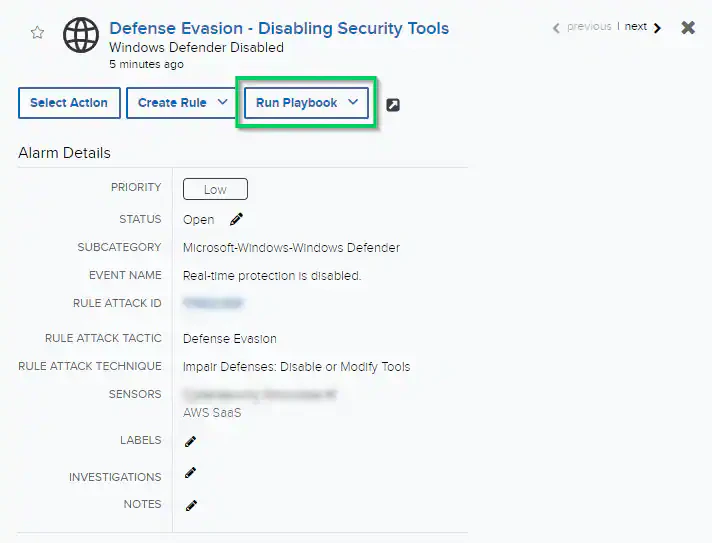 Click Run Playbook to open a list of all playbooks available for that alarm, and then select the automated playbook you want to manually initiate.