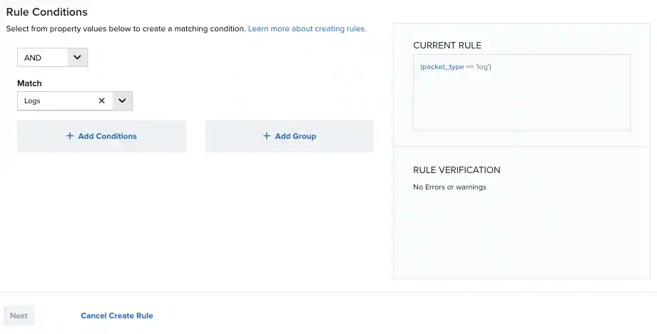 - Click Add Conditions and select the property values you want to include in the rule to create a matching condition.