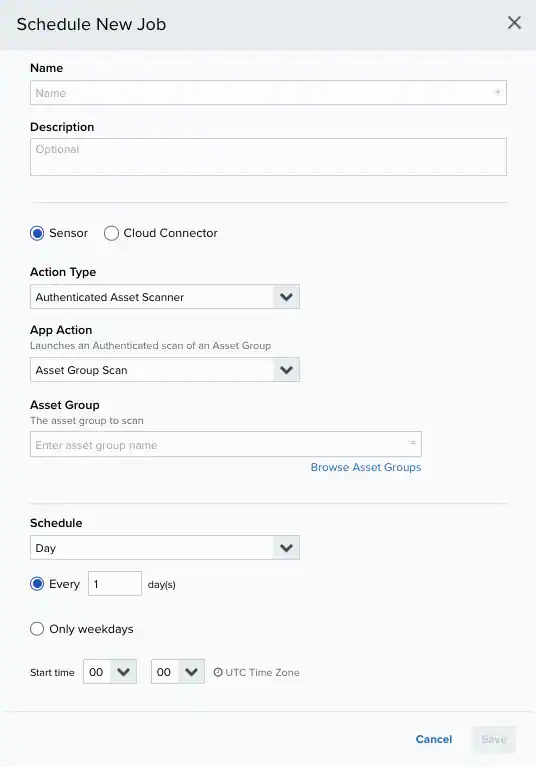 Discovers assets in your environment, detects changes in assets, and discovers assets in the network.- Select Existing Asset Group: In the Enter asset group name field, search for the asset groups to scan. These asset groups are already existing, and you can search for them by entering the name of the asset group or by browsing for them.