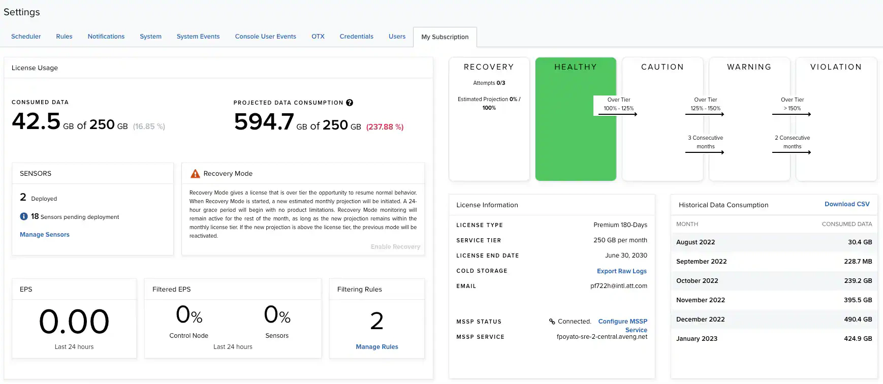 | Consumed Data | The amount of data USM Anywhere has processed every month. |