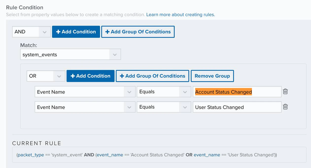 - Under Rule Condition, use the Match drop-down list to select system_events.