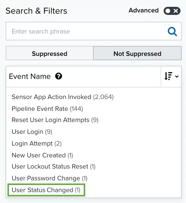Locate the Event Name filter and select either User Status Changed or Account Status Changed.