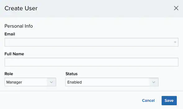 - Enter the user’s Email address and Full Name. This is the email address used to verify the account and set the initial password.