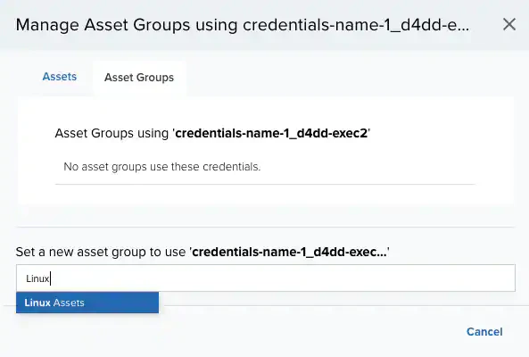 After you select the asset group, the dialog displays the item at the top. If needed, you can enter text for another asset group name and select it to assign multiple asset groups for the credential set.