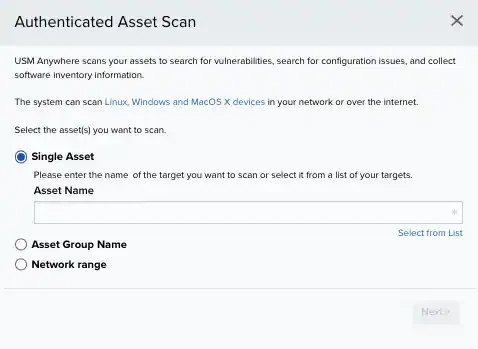An verifies scanned IPs and detects vulnerabilities, , and software. The USM Anywhere initiates a credentialed (Linux), WinRM (Windows), or MacOS connection to the and remotely runs a series of commands for host-based assessment. See Managing Credentials in USM Anywhere. You can run authenticated asset scans from these pages: