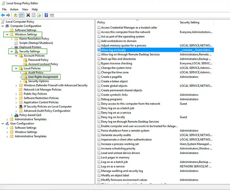 In the console tree, select Computer Configuration > Windows Settings > Security Settings > Local Policies > User Rights Assignment.