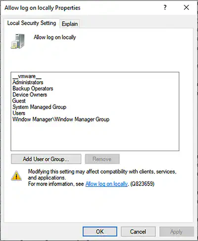 Click Allow Log on Locally to open its properties.