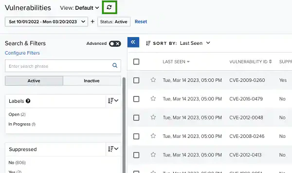 - At the top of the page, you can see any filters you have applied, and you have the option to create and select different views of the vulnerabilities.