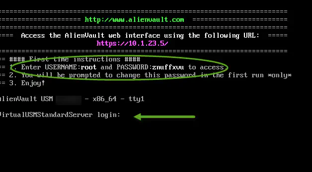 SSHclient. The LevelBlue splash screen for USM Appliance appears. If this is the first time, it displays the root username and a randomly generated password for you to enter.