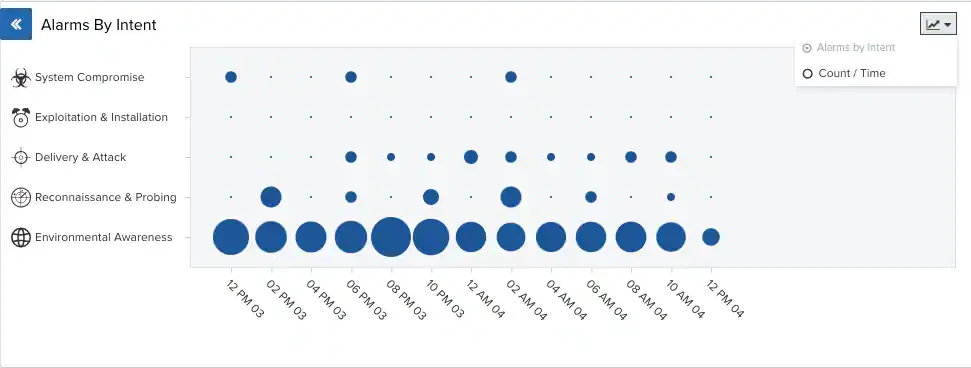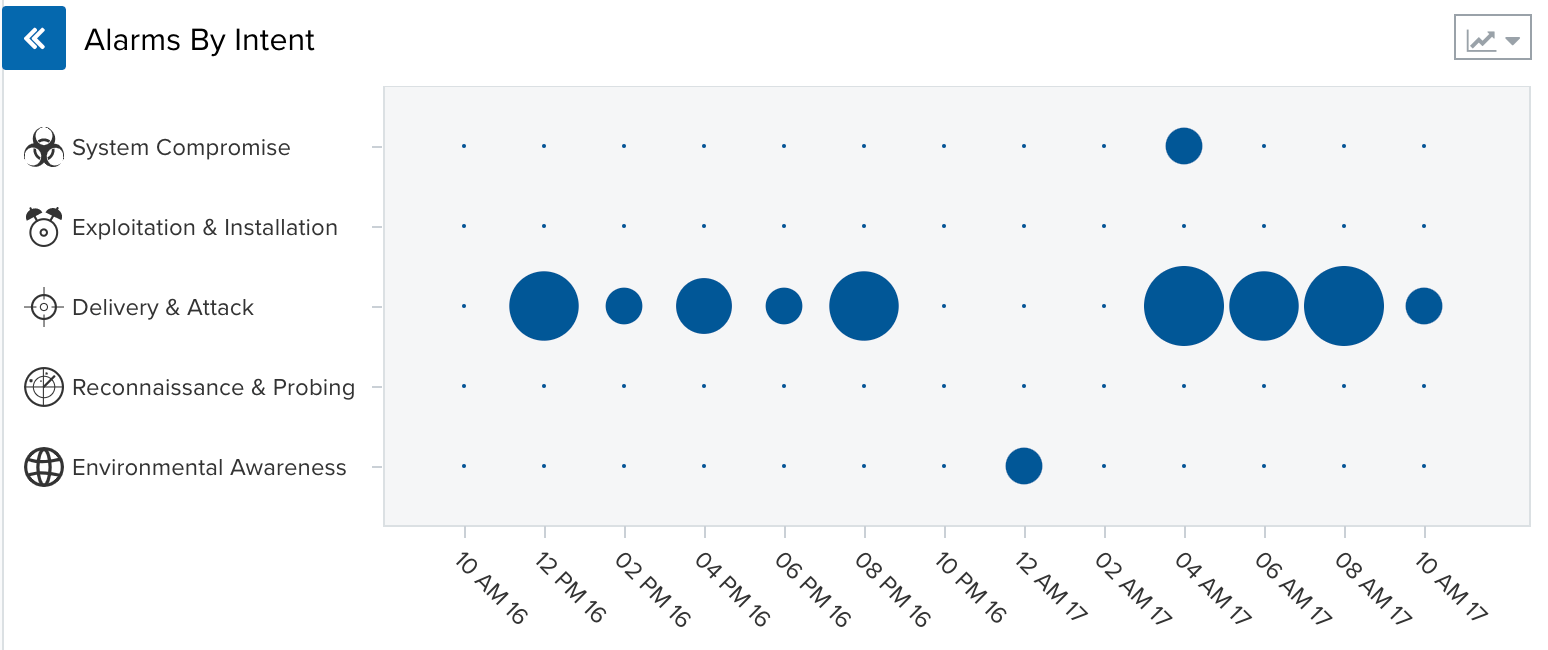 The Alarms by Intent graph in the middle of the page provides a graphical representation of alarms by intent. The blue circles indicate the number of times that an alarm in an intent occurred. A bigger circle indicates a higher number of alarms. You can hover over each of the circles to get the actual number of alarms per intent. In addition, clicking a blue circle displays a list of only the alarms corresponding to that circle. You can change the displayed period of time by clicking the Last 24 Hours filter. Alarms graphed by intent are sorted into five different categories, which are represented by the graphic icons in the display:- Delivery & Attack (