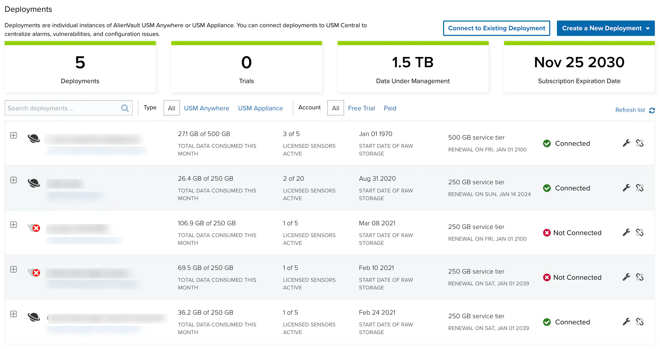 The Deployments page lists all USM Anywhere and USM Appliance deployments associated with your USM Central environment. The list displays data consumption, , storage, subscription, and connection status information for each deployment. The following table shows the deployment status types. Deployment Status Types| Status | Description |